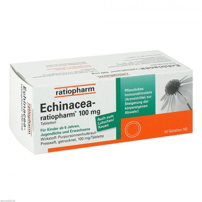 Echinacea-ratiopharm 100 mg Tabletten. Wirkstoff: Purpursonnenhutkraut-Presssaft. Anwendungsgebiete: zur unterstützenden Behandlung häufig wiederkehrender Infekte im Bereich der Atemwege und der ableitenden Harnwege. Warnhinweis: Enthält Sorbitol!
