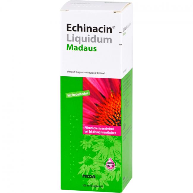 Echinacin Liquidum Madaus Flüssigkeit. Wirkstoff: Presssaft aus frischem, blühendemPurpursonnenhutkraut. Anwendungsgebiete: Unterstützende Behandlung rezidivierender(wiederkehrender) Infekte im Bereich der Atemwege und der ableitenden Harnwege. Zur Anwendung bei Atemwegsinfekten: Bei länger anhaltenden Beschwerden, bei Atemnot, bei Fieber oder eitrigem oder blutigem Auswurf sollte ein Arzt aufgesucht werden. Zur Anwendung bei Harnwegsinfekten: Bei Blut im Urin, bei Fieber, bei Anhalten der Beschwerden über 5 Tage solle ein Arzt aufgesucht werden. Warnhinweis: Enthält 22 Vol.-% Alkohol.
