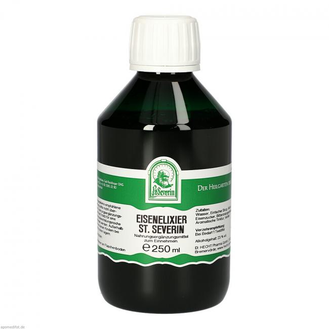 Aqua, Sirup. Simplex, Alcohol, Ferrum oxydat. Saccarosum, Tinktura Aurantii Amari, Tinctura Aromaticum, Vanillin.Eisenelixier St. Severin enthält zweiwertiges Eisen. Alle verwendeten Rohstoffe entsprechen der Arzneibuchqualität. Vor Gebrauch gut schütteln! Alkoholgehalt: 22% Vol.