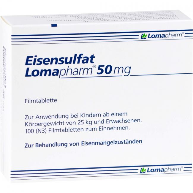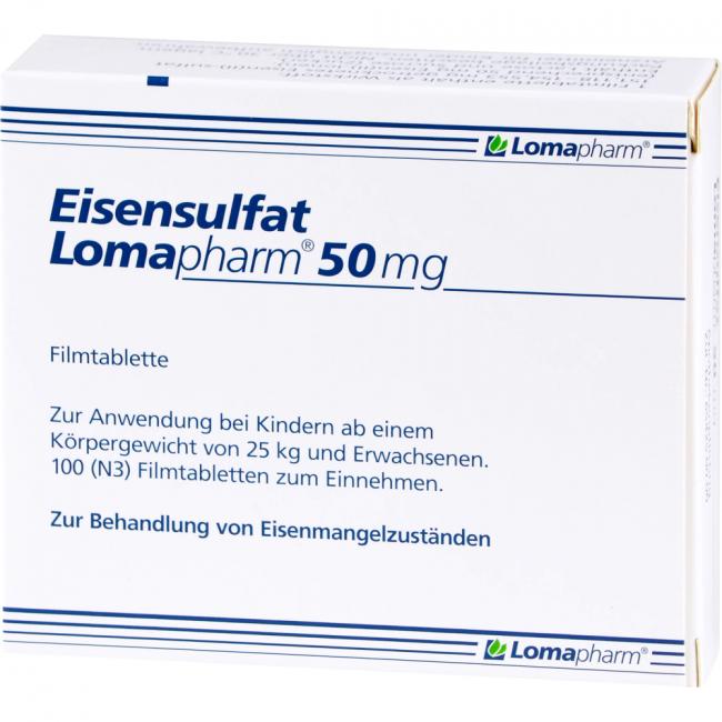 Eisensulfat Lomapharm 50 mg Filmtabletten. Wirkstoff: Getrocknetes Eisen(II)-sulfat. Anwendungsgebiete: zur Behandlung von Eisenmangelzuständen. Warnhinweis: Enthält Lactose und Sucrose