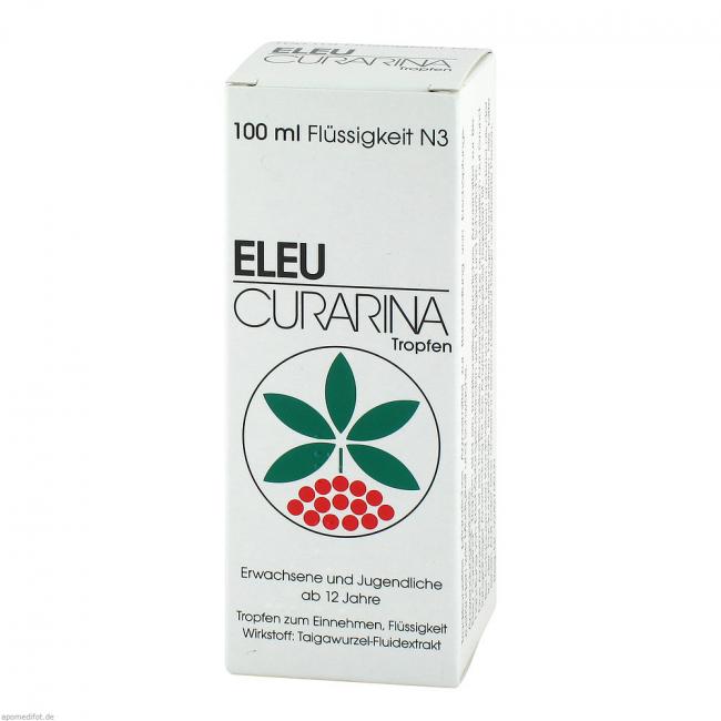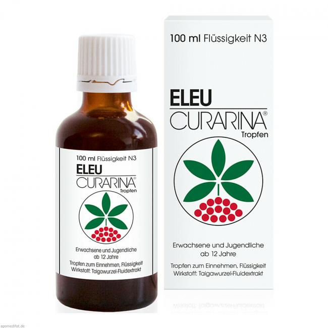 Eleu Curarina Tropfen. Wirkstoff: Eleutherococcuswurzel-Fluidextrakt. Anwendungsgebiete: angewendet als Tonikum zur Stärkung und Kräftigung bei Müdigkeits- und Schwächegefühl, nachlassender Leistungs- und Konzentrationsfähigkeit sowie In der Rekonvaleszenz. Warnhinweis: Enthält 32 Vol.-% Alkohol!