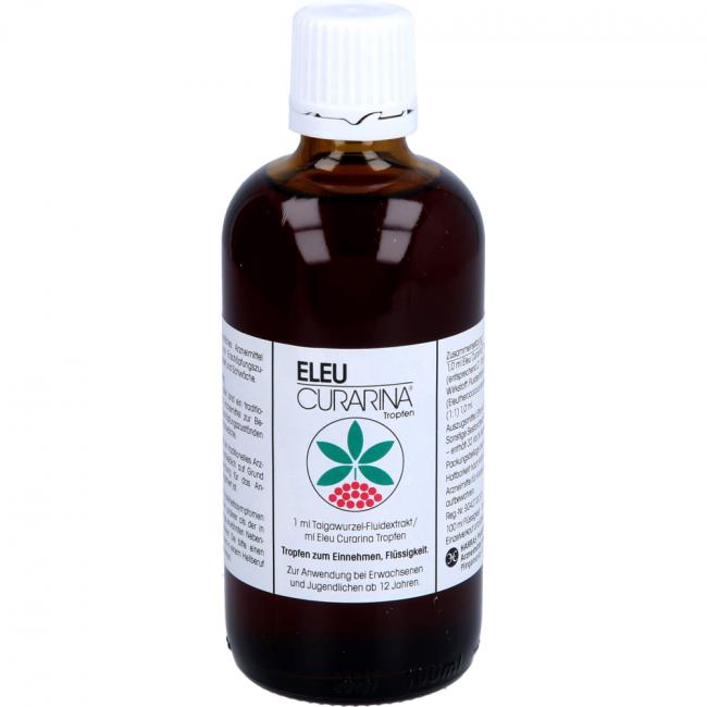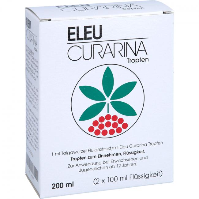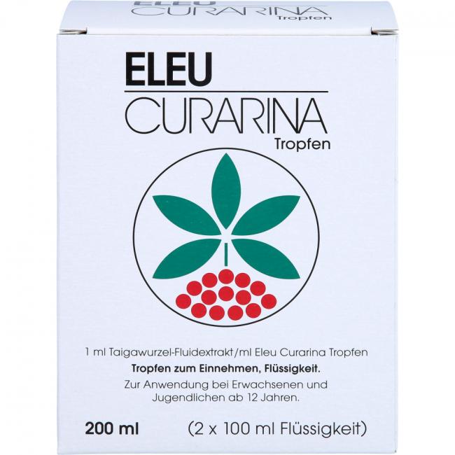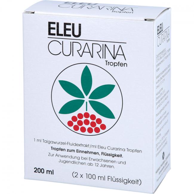 Eleu Curarina Tropfen. Wirkstoff: Eleutherococcuswurzel-Fluidextrakt. Anwendungsgebiete: Als Tonikum zur Stärkung und Kräftigung bei Müdigkeits- und Schwächegefühl, nachlassender Leistungs- und Konzentrationsfähigkeit sowie in der Rekonvaleszenz. Warnhinweis: Enthält 32 Vol.-% Alkohol!