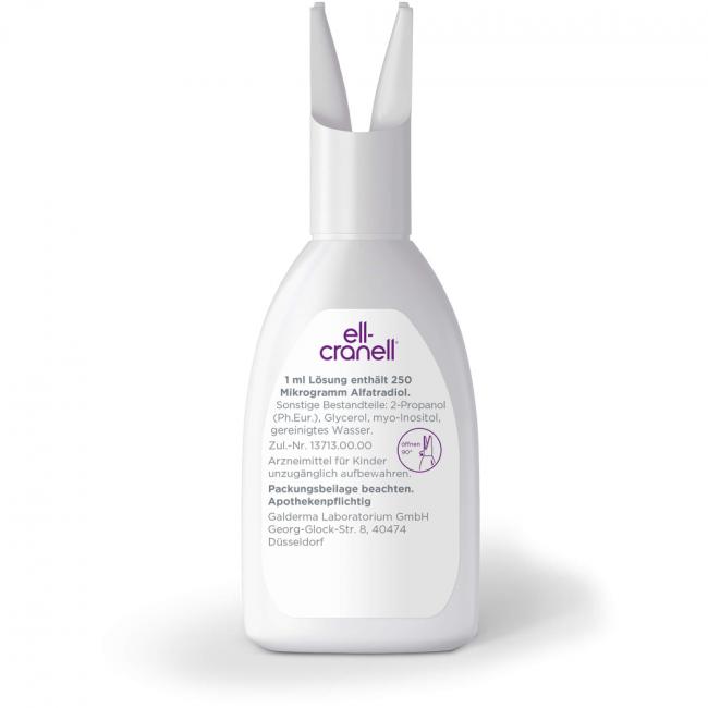 Ell-Cranell 250, Lösung. Wirkstoff: Alfatradiol. Anwendungsgebiete: zur Steigerung der verminderten Anagenhaarrate bei der leichten androgenetischen Alopezie (hormonell-erblich bedingter Haarausfall) bei Männern und Frauen.