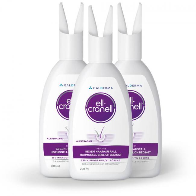 Ell-Cranell 250, Lösung. Wirkstoff: Alfatradiol. Anwendungsgebiete: zur Steigerung der verminderten Anagenhaarrate bei der leichten androgenetischen Alopezie (hormonell-erblich bedingter Haarausfall) bei Männern und Frauen.