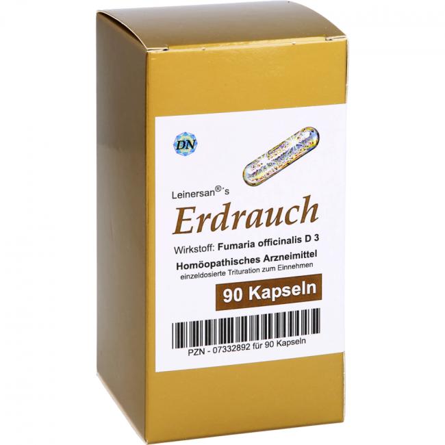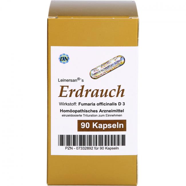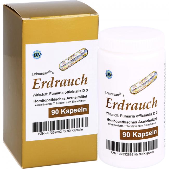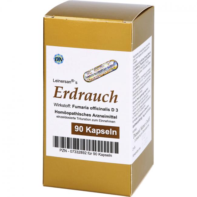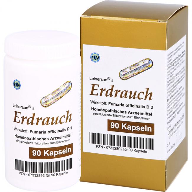 Leinersan's Erdrauch, Kapseln. Wirkstoff: Fumaria Officinalis D3. Anwendungsgebiete: Registriertes homöopathisches Arzneimittel, daher ohne Angabe einer therapeutischen Indikation.