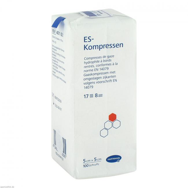 Pflichtangaben ES-KOMPRESSEN unsteril 5x5 cm 8fach, 100 Stück