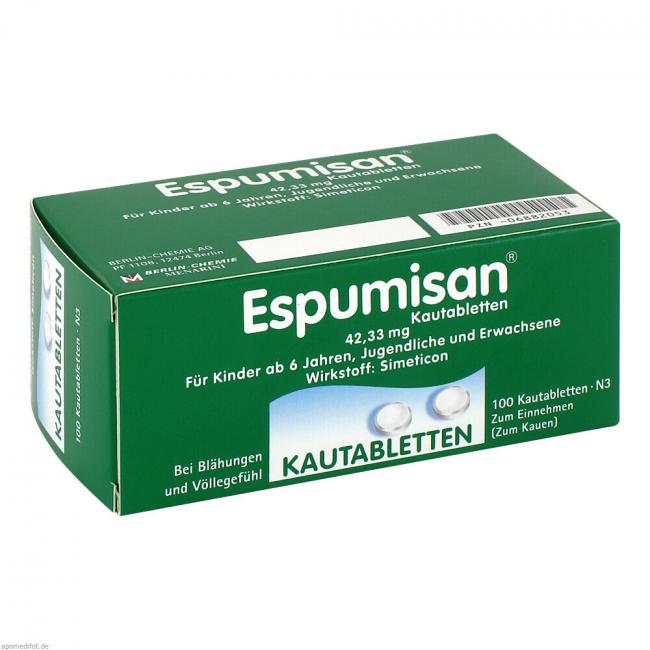 Espumisan Kautabletten 42,33 mg. Wirkstoff: Simeticon. Anwendungsgebiete: zur symptomatischen Behandlung gasbedingter Magen-Darm-Beschwerden, wie z.B. Blähungen (Meteorismus), Völlegefühl und zur Vorbereitung von Untersuchungen im Bauchbereich, wie z.B. Röntgen und Sonographie (Ultraschall).