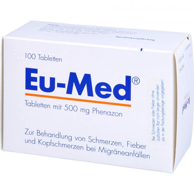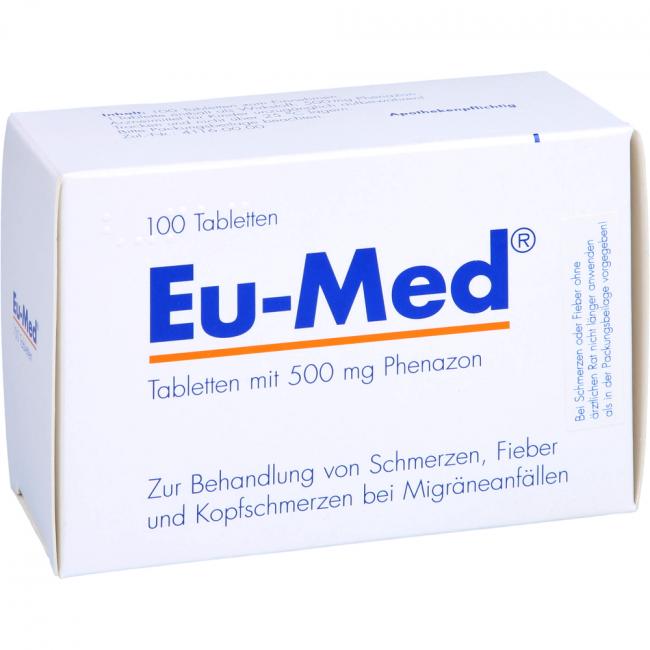 Eu-Med, Tabletten. Wirkstoff: Phenazon. Anwendungsgebiete: bei leichten bis mäßig starken Schmerzen, bei Fieber, zur akuten Behandlung der Kopfschmerzen bei Migräneanfällen mit und ohne Aura.