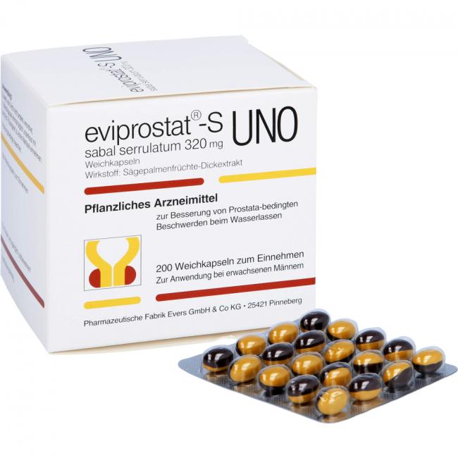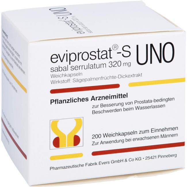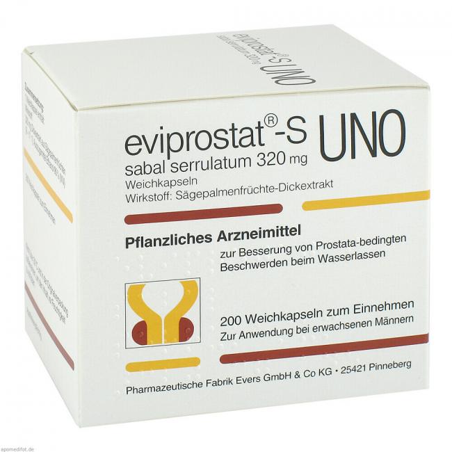 eviprostat-S sabal serrulatum 320 mg UNO Weichkapseln. Wirkstoff: Sägepalmenfrüchte-Dickextrakt. Anwendungsgebiete: Pflanzliches Arzneimittel gegen Beschwerden beim Wasserlassen bei einer gutartigen Vergrößerung der Prostata (Miktionsbeschwerden bei benigner Prostatahyperplasie im Stadium I bis II nach Alken bzw. II bis III nach Vahlensieck).