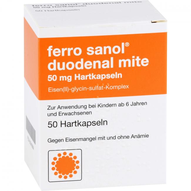 ferro sanol duodenal mite 50 mg Hartkapseln. Wirkstoff: Eisen(II)-glycin-sulfat-Komplex. Anwendungsgebiete: Erwachsene und Kinder ab 6 Jahren (mit mind. 20 kg Körpergewicht) mit Eisenmangel, insbesondere Eisenmangelanämie, während der Schwangerschaft und Stillzeit; im Kindesalter; bei eisenarmer Diät, nach akuten u. chronischen Blutverlusten.