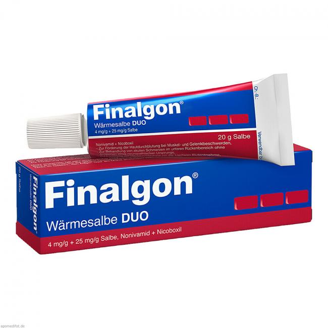 So wirkt Finalgon Wärmecreme DUO. Finalgon Wärmecreme DUO ist eine durchblutungssteigernde Creme zur Wärmereiz-Therapie. Finalgon Wärmecreme DUO wird angewendet zur Förderung der Hautdurchblutung bei Muskel- und Gelenkbeschwerden.