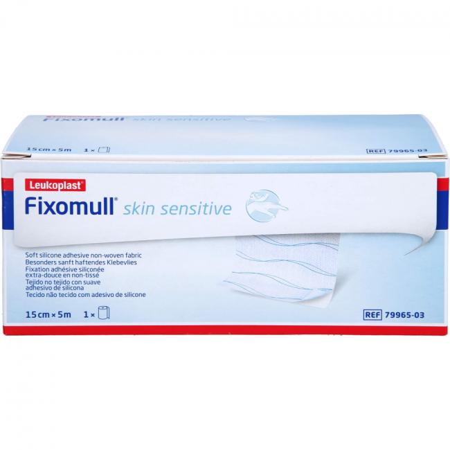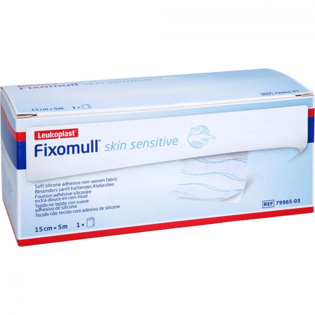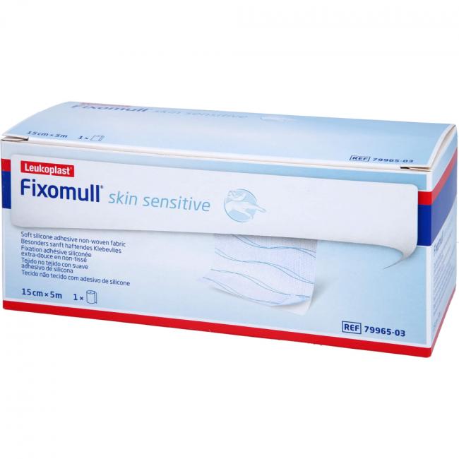 Fixomull skin sensitive dient der besonders schonenden vollflächigen Fixierung für Patienten mit empfindlicher und geschädigter Haut. Dank des sanft haftenden Silikonauftrages ist selbst sehr empfindliche Haut wie Babyhaut, Altershaut, Pergamenthaut, Cortisonhaut oder durch häufige Fixierung beanspruchte Haut sicher versorgt. Neben einem sicheren Halt kann ein atraumatischer und schmerzarmer Verbandwechsel gewährleistet werden, wodurch Hautschädigungen vorgebeugt werden können. Darüber hinaus lässt sich Fixomull skin sensitive mehrfach repositionieren, ohne an Klebkraft zu verlieren oder Kleberück stände auf der Haut zu hinterlassen. Fixomull skin sensitive ist sehr flexibel und querelastisch dehnbar, weshalb es sich an konturierten Körperstellen hervorragend anschmiegt und einen hohen Tragekomfort bietet. Der bedarfsgerechte Zuschnitt ermöglicht eine einfache und schnelle Applikation. Zudem verfügt es über wasserdampfdurchlässige Materialien, wodurch das Risiko von Mazerationen reduziert wird. Mit Fixomull skin sensitive wird die Haut optimal geschont und eine erfolgreiche Therapie unterstützt. Fixomull skin sensitive besteht aus einem weichen Polyestervlies, beschichtet mit einem Silikonauftrag.