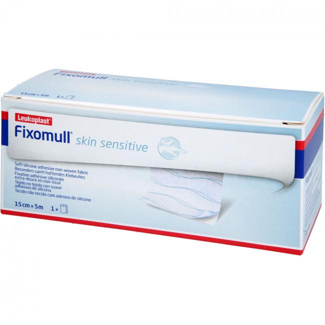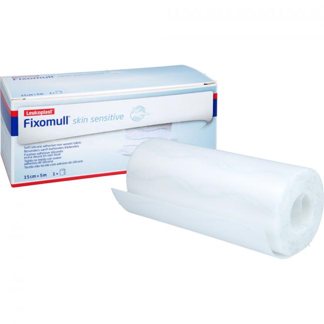 Fixomull skin sensitive dient der besonders schonenden vollflächigen Fixierung für Patienten mit empfindlicher und geschädigter Haut. Dank des sanft haftenden Silikonauftrages ist selbst sehr empfindliche Haut wie Babyhaut, Altershaut, Pergamenthaut, Cortisonhaut oder durch häufige Fixierung beanspruchte Haut sicher versorgt. Neben einem sicheren Halt kann ein atraumatischer und schmerzarmer Verbandwechsel gewährleistet werden, wodurch Hautschädigungen vorgebeugt werden können. Darüber hinaus lässt sich Fixomull skin sensitive mehrfach repositionieren, ohne an Klebkraft zu verlieren oder Kleberück stände auf der Haut zu hinterlassen. Fixomull skin sensitive ist sehr flexibel und querelastisch dehnbar, weshalb es sich an konturierten Körperstellen hervorragend anschmiegt und einen hohen Tragekomfort bietet. Der bedarfsgerechte Zuschnitt ermöglicht eine einfache und schnelle Applikation. Zudem verfügt es über wasserdampfdurchlässige Materialien, wodurch das Risiko von Mazerationen reduziert wird. Mit Fixomull skin sensitive wird die Haut optimal geschont und eine erfolgreiche Therapie unterstützt. Fixomull skin sensitive besteht aus einem weichen Polyestervlies, beschichtet mit einem Silikonauftrag.