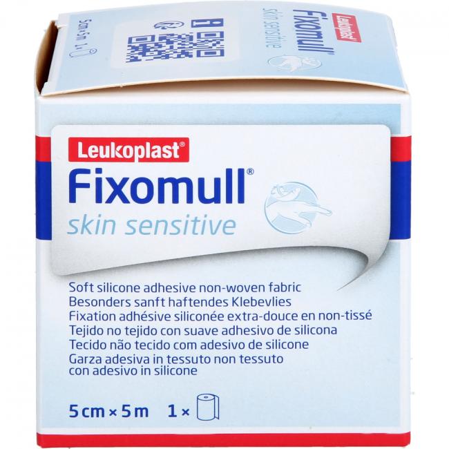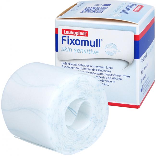 Fixomull skin sensitive dient der besonders schonenden vollflächigen Fixierung für Patienten mit empfindlicher und geschädigter Haut. Dank des sanft haftenden Silikonauftrages ist selbst sehr empfindliche Haut wie Babyhaut, Altershaut, Pergamenthaut, Cortisonhaut oder durch häufige Fixierung beanspruchte Haut sicher versorgt. Neben einem sicheren Halt kann ein atraumatischer und schmerzarmer Verbandwechsel gewährleistet werden, wodurch Hautschädigungen vorgebeugt werden können. Darüber hinaus lässt sich Fixomull skin sensitive mehrfach repositionieren, ohne an Klebkraft zu verlieren oder Kleberück stände auf der Haut zu hinterlassen. Fixomull skin sensitive ist sehr flexibel und querelastisch dehnbar, weshalb es sich an konturierten Körperstellen hervorragend anschmiegt und einen hohen Tragekomfort bietet. Der bedarfsgerechte Zuschnitt ermöglicht eine einfache und schnelle Applikation. Zudem verfügt es über wasserdampfdurchlässige Materialien, wodurch das Risiko von Mazerationen reduziert wird. Mit Fixomull skin sensitive wird die Haut optimal geschont und eine erfolgreiche Therapie unterstützt. Fixomull skin sensitive besteht aus einem weichen Polyestervlies, beschichtet mit einem Silikonauftrag.