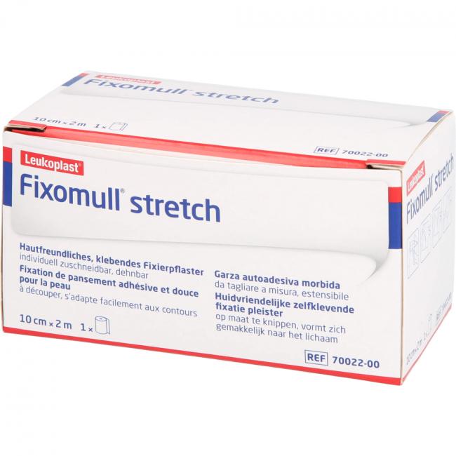 Verbände anlegen und fixieren erfordert höchste Anpassungsfähigkeit und Flexibilität im OP, auf der Station und in der ambulanten Versorgung. Mit Fixomull stretch können insbesondere großflächige Verbände einfach und schnell fixiert werden. Durch den bedarfsgerechten Zuschnitt ist die Methode material- und kostensparend. Fixomull stretch ist durch seine Querelastizität anschmiegsam und passt sich auch stark konturierten Körperpartien gut an. Abschnürungen, Stauungen und Durchblutungsstörungen werden verhindert. Fixomull stretch verfügt über eine gute Sofort- und Dauerklebkraft und gute Luft- und Wasserdampfdurchlässigkeit. Es beugt Kontaminationen vor, wird auch von hautempfindlichen Patienten ausgezeichnet vertragen und ist einfach und vielfältig einsetzbar. Fixomull stretch ist besonders wirtschaftlich in der 20-Meter-Großrolle. Fixomull stretch besteht aus einem Polyestervlies, beschichtet mit Polyacrylatkleber.