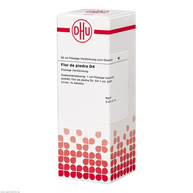 Flor de Piedra D 4. Anwendungsgebiete: Registriertes homöopathisches Arzneimittel, daher ohne Angabe einer therapeutischen Indikation. Warnhinweis: Enthält 51 Vol.% Alkohol.