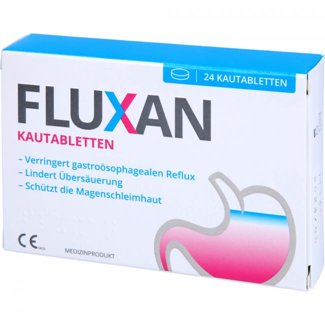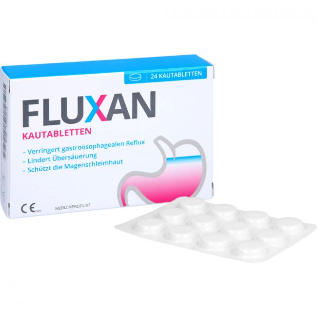 Fluxan dient der Behandlung und Vorbeugung von gastroösophagealem Reflux, brennendem Gefühl, Magenübersäuerung und dem Schutz der Schleimhäute in Magen und Speiseröhre. Fluxan ermöglicht die Kontrolle einer Übersäuerung des Magens und beugt Brennen, Magenschmerzen und da mit zusammenhängenden Verdauungsbeschwerden vor. Fluxan wirkt unabhängig von der Ursache der Beschwerden; darüber hinaus kann es als Adjuvans bei Gastritis eingesetzt werden.