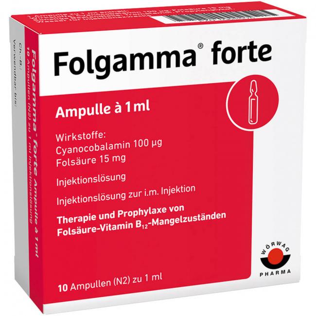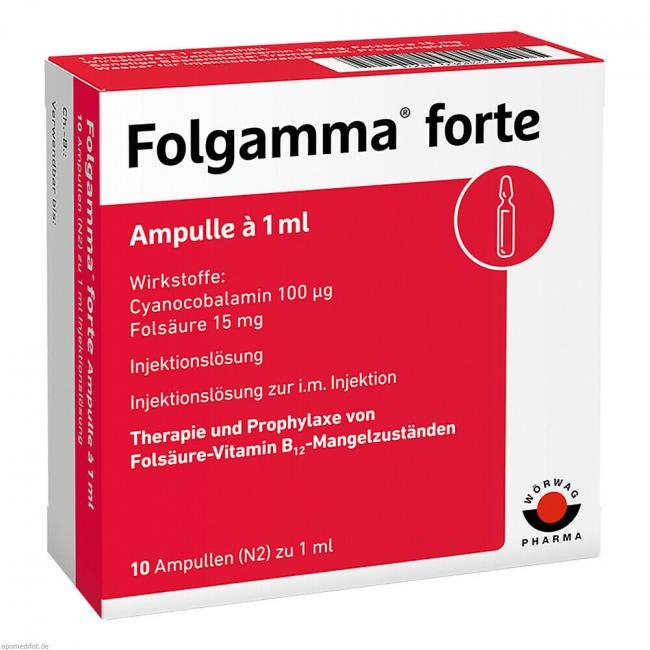 Folgamma forte Ampulle a 1 ml, Injektionslösung i.m.. Anwendungsgebiete: Therapie und Prophylaxe von isolierten kombinierten Folsäure- und Vitamin B12-Mangelzuständen bei intestinalen Resorptionsstörungen.