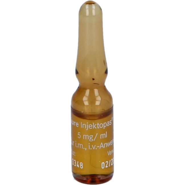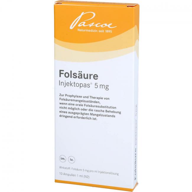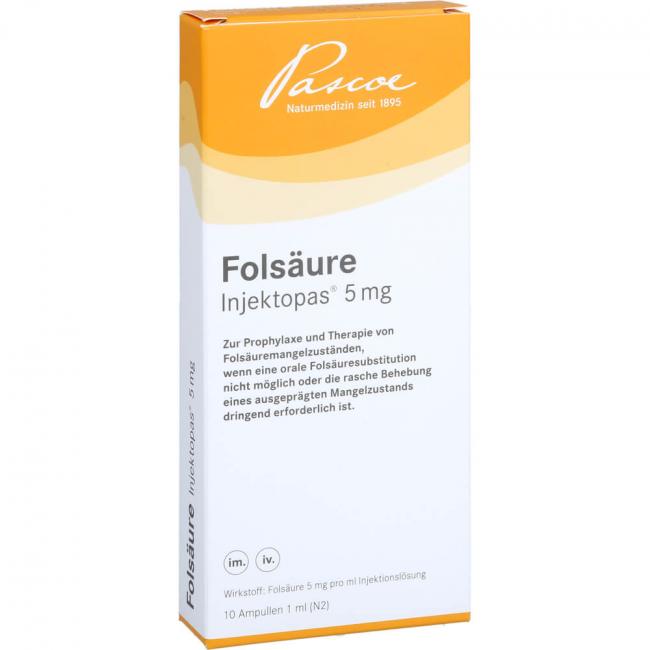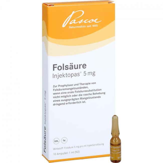 Folsäure Injektopas 5 mg, Injektionslösung. Anwendungsgebiete: Prophylaxe und Therapie von Folsäuremangelzuständen, wenn eine orale Folsäuresubstitution nicht möglich oder die rasche Behebung eines ausgeprägten Mangelzustands dringend erforderlich ist.