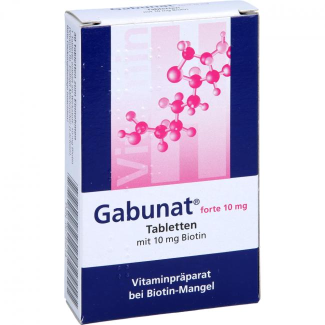 Gabunat forte 10 mg. Wirkstoff: 10 mg Biotin. Anwendungsgebiet: Vorbeugung und Behandlung eines Biotin-Mangels (zur Vorbeugung sind weniger als 0,2 mg/Tag ausreichend). Warnhinweis: enthält Milchzucker (Lactose).