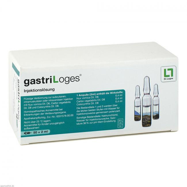 gastriLoges Injektionslösung, Flüssige Verdünnung zur Injektion. Anwendungsgebiete: Die Anwendungsgebiete leiten sich von den homöopathischen Arzneimittelbildern ab. Dazu gehört: Besserung von Magenbeschwerden.