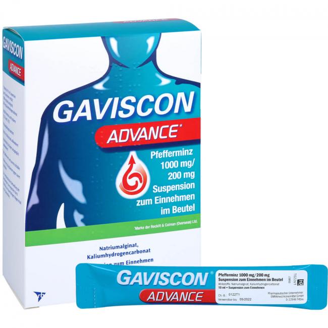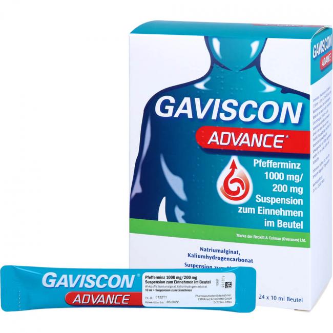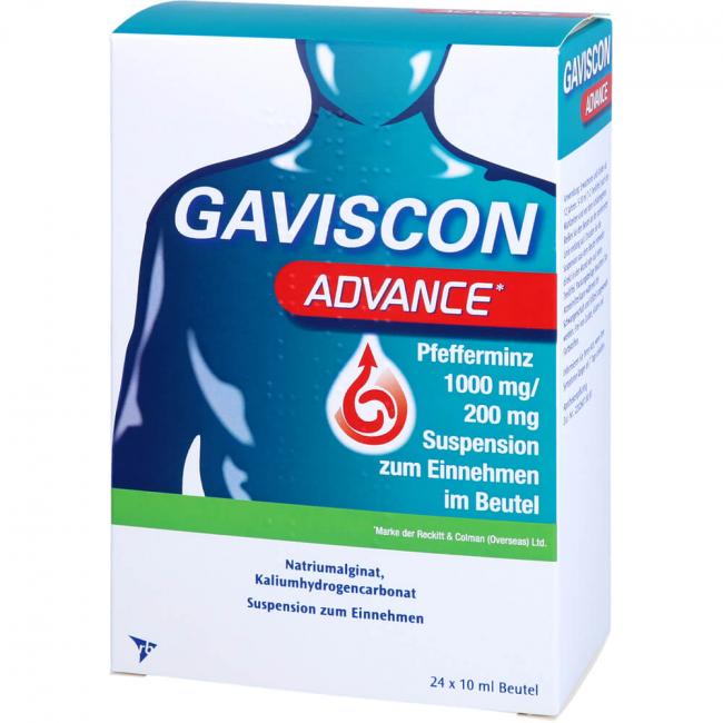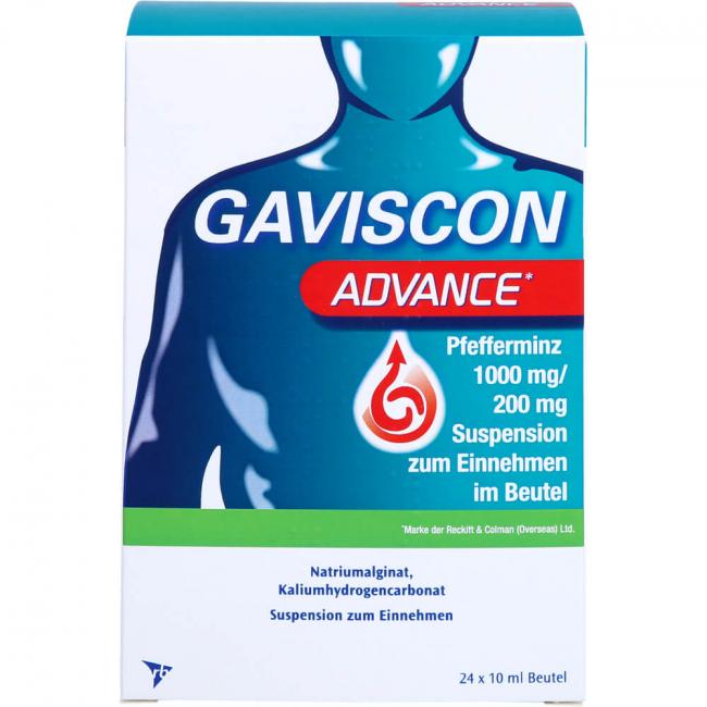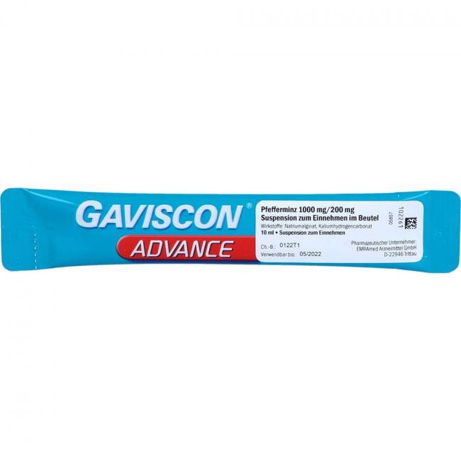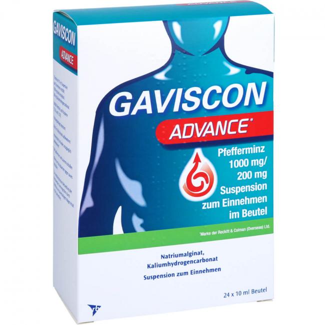 Gaviscon Advance Pfefferminz 1000 mg/200 mg Suspension zum Einnehmen. Wirkstoffe: Natriumalginat und Kaliumhydrogencarbonat. Anwendungsgebiete: Zur symptomatischen Behandlung von Beschwerden durch Rückfluss von saurem Mageninhalt (gastroösophagealer Reflux) wie saures Aufstoßen, Sodbrennen, Verdauungsstörungen Infolge eines Reflux des Mageninhalts, z.B. nach Mahlzeiten, während der Schwangerschaft oder als Begleiterscheinung bei Entzündung der Speiseröhre bedingt durch Rückfluss von saurem Mageninhalt in die Speiseröhre (Refluxösophagitis). Warnhinweis: Enthält Methyl-4-hydroxybenzoat (E218) und Propyl-4-hydroxybenzoat (E216).