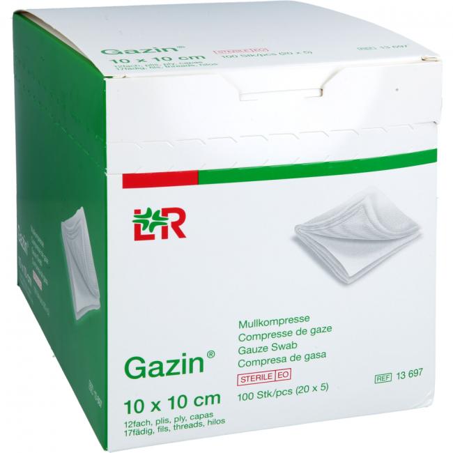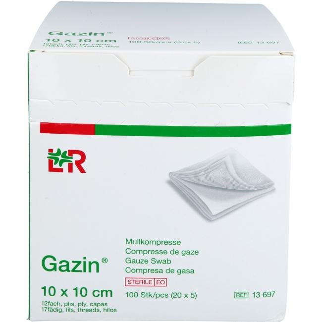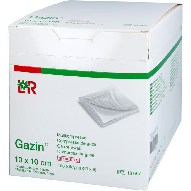 Pflichtangaben GAZIN Mullkomp.10x10 cm steril 12fach groß, 20x5 Stück