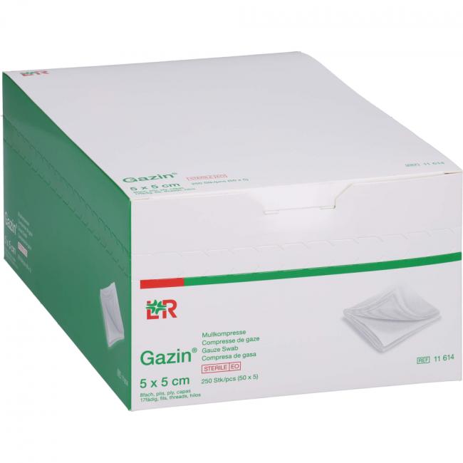 Pflichtangaben GAZIN Mullkomp.5x5 cm steril 8fach, 50x5 Stück