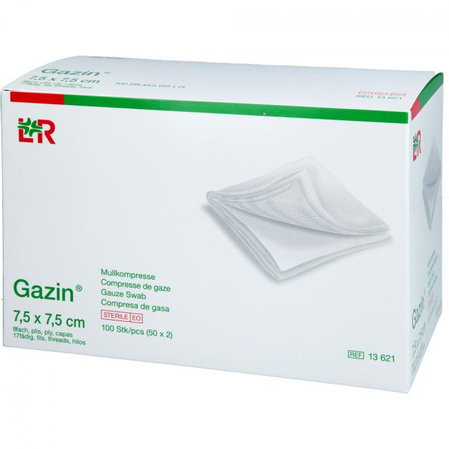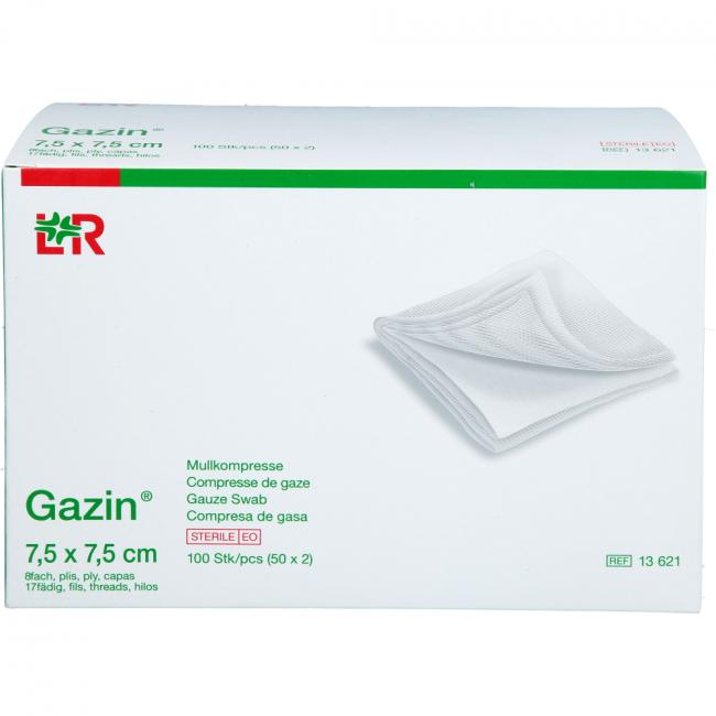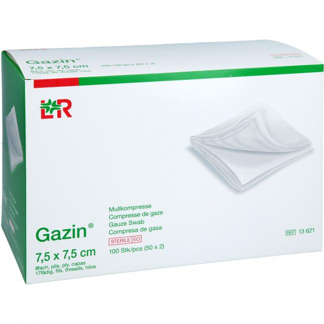Pflichtangaben GAZIN Mullkomp.7,5x7,5 cm steril 8fach, 50x2 Stück