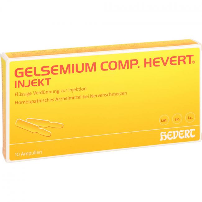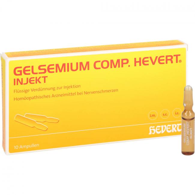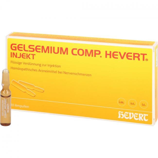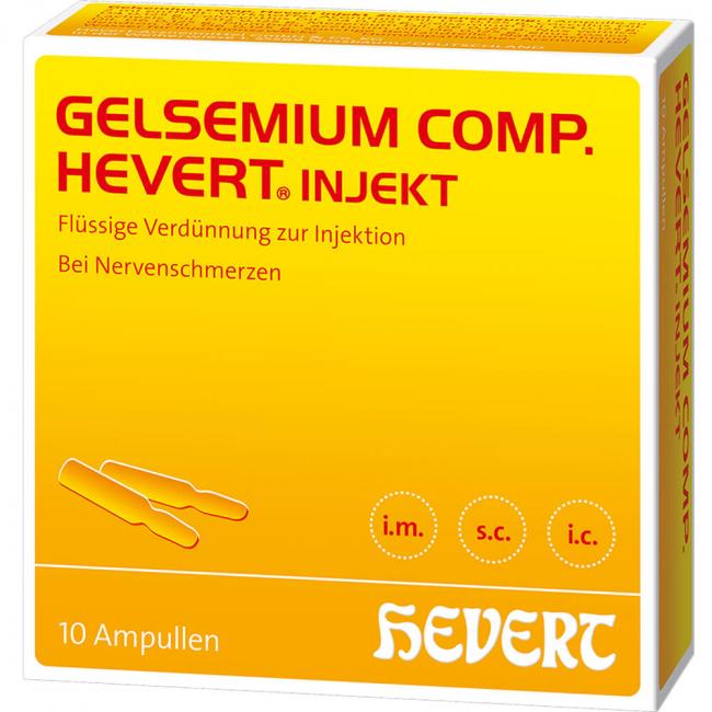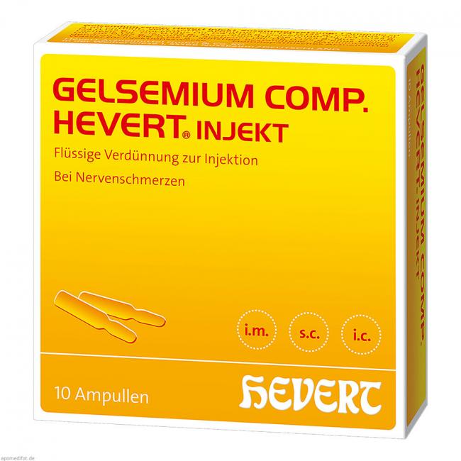 Gelsemium comp. Hevert injekt, Flüssige Verdünnung zur Injektion. Anwendungsgebiete: Die Anwendungsgebiete leiten sich von den homöopathischen Arzneimittelbildern ab. Dazu gehören: Nervenschmerzen.