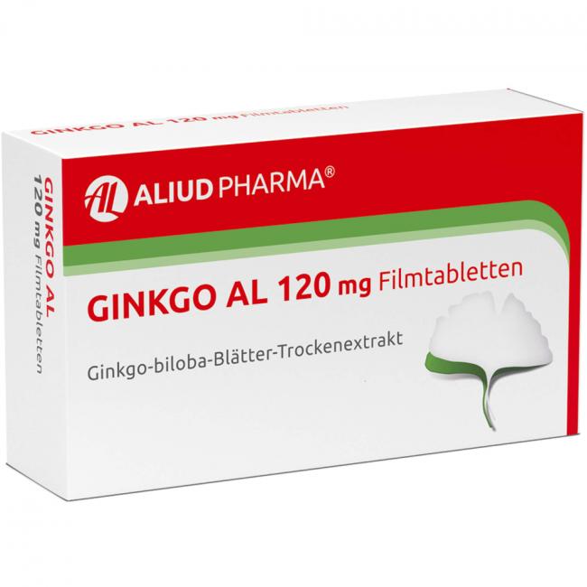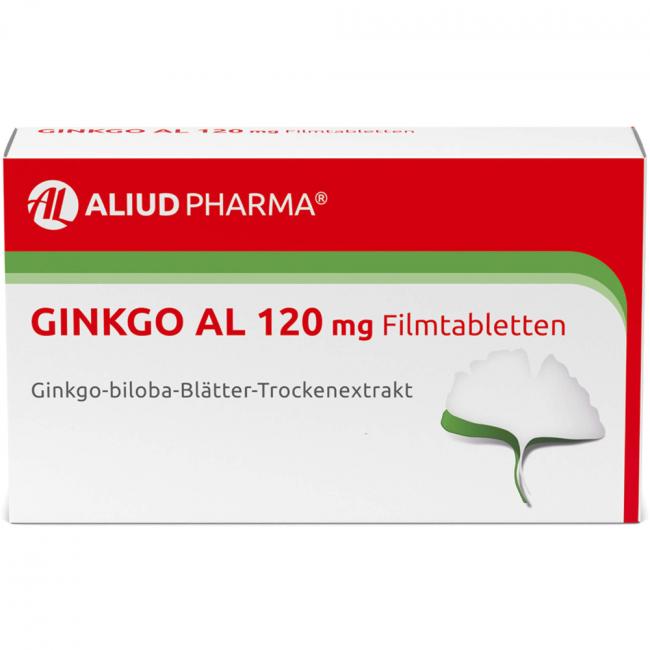 Ginkgo AL 120 mg Filmtabletten. Wirkstoff: Ginkgo-biloba-Blätter Trockenextrakt. Anwendungsgebiete: pflanzliches Arzneimittel zur Verbesserung einer altersbedingten kognitiven Beeinträchtigung und der Lebensqualität bei leichter Demenz. Enthält Lactose und Glucose.