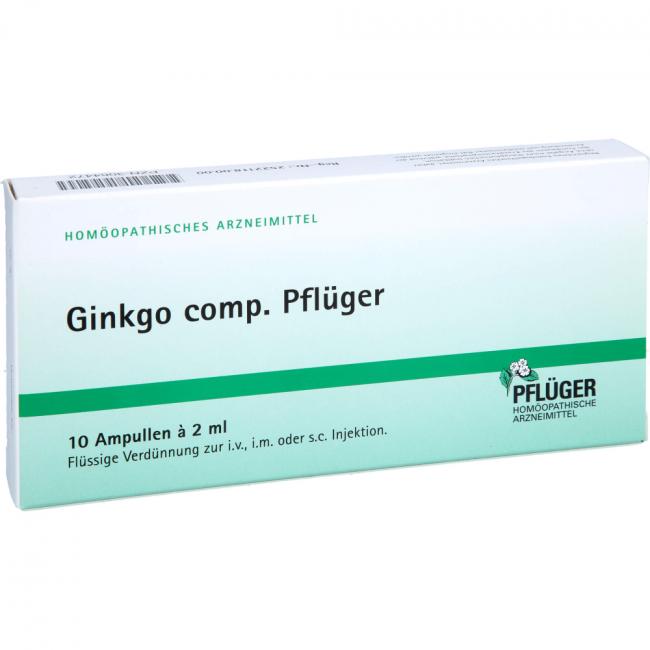 Ginkgo comp. Pflüger, Flüssige Verdünnung zur Injektion. Anwendungsgebiete: Registriertes homöopathisches Arzneimittel, daher ohne Angabe einer therapeutischen Indikation.