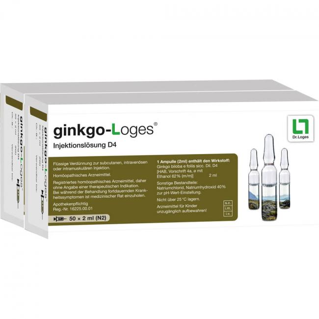 ginkgo-Loges Injektionslösung D4, Flüssige Verdünnung zur Injektion. Anwendungsgebiete: Registriertes homöopathisches Arzneimittel und daher ohne Angabe einer therapeutischen Indikation.