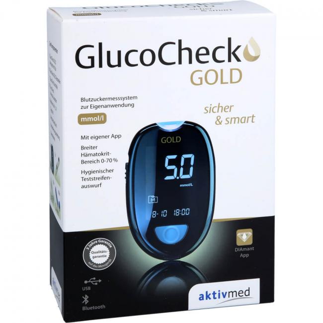 GlucoCheck Gold - das Messsystem für alle. Goldrichtig messen! Das innovative GlucoCheck Gold mit breitem Hämatokritbereich von 0 - 70% bietet auch multimorbiden Patienten besondere Sicherheit. Zudem zeichnet sich das GlucoCheck Gold durch seine umfangreichen Anbindungsmöglichkeiten aus. Aufgrund des USB-Anschlusses sowie einer Bluetooth-Schnittstelle lässt es sich bequem mit dem PC oder der zugehörigen DIAmant-App verbinden.
