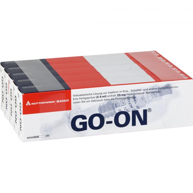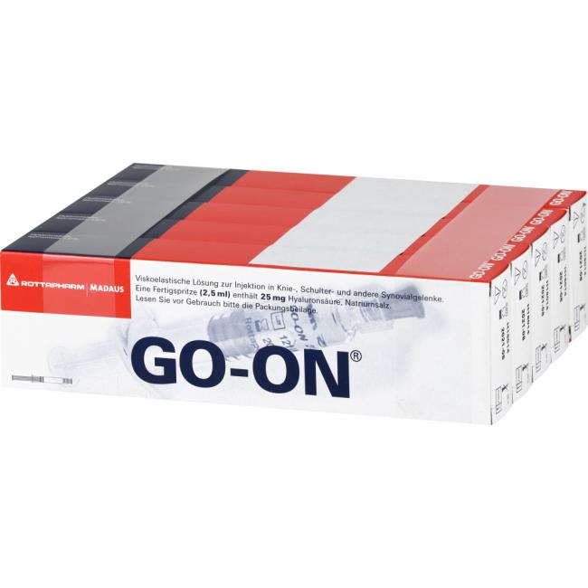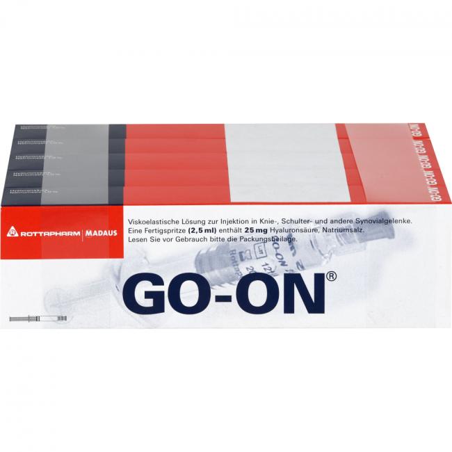 GO-ON liegt als Fertigspritze mit 2,5 ml (25 mg) Natriumhyaluronat-Lösung vor. Das Produkt wurde innerhalb des Blisters mit Dampf sterilisiert. Eine Packung enthält 1 Spritze.