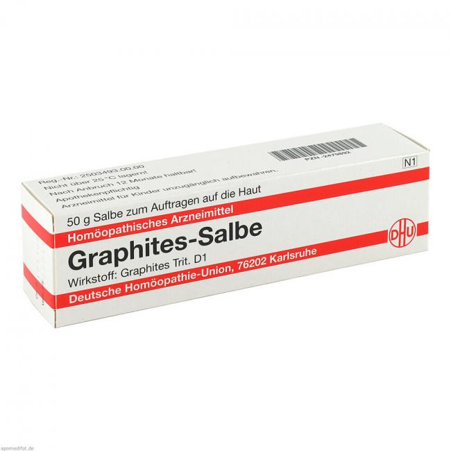 Graphites-Salbe. Anwendungsgebiete: Registriertes homöopathisches Arzneimittel, daher ohne Angabe einer therapeutischen Indikation.
