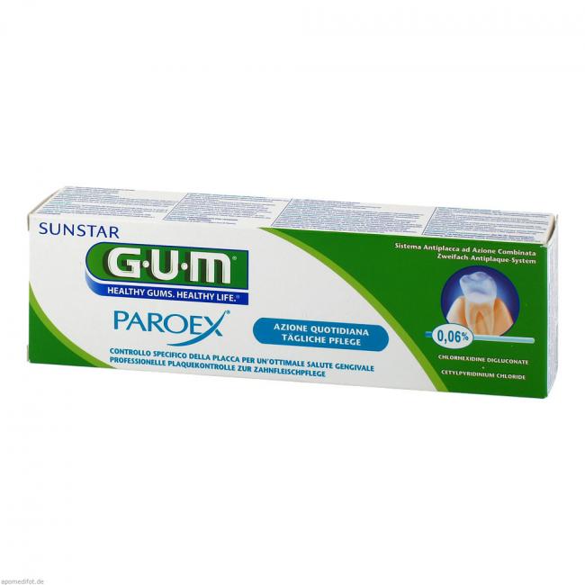 GUM Paroex Tägliche Pflege Zahnpasta hilft die Gesundheit von sensiblem Parodontalgewebe zu verbessern. Sie kann insbesondere zur intensiven Pflege bei frühen Anzeichen von empfindlichem Zahnfleisch eingesetzt werden. Auch empfohlen zur Pflege kieferorthopädischer Apparaturen, bei Implantaten, Zahnprothesen sowie Personen mit eingeschränkter Mundhygiene.