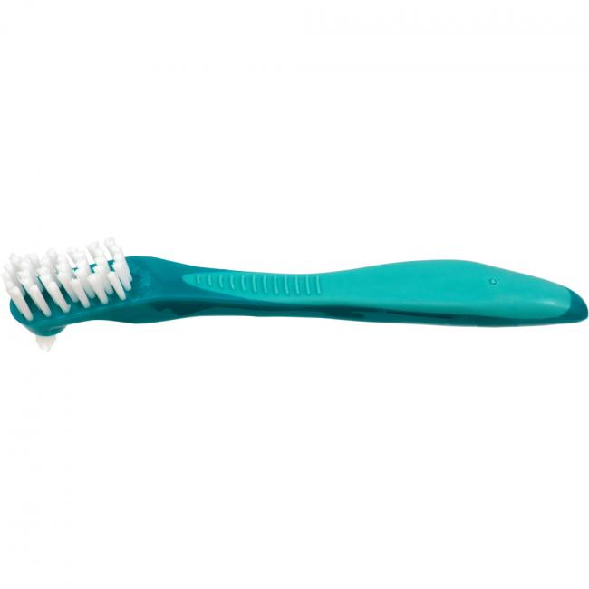 Wenn Sie eine Zahnprothese tragen, dann wissen Sie, dass es nicht immer einfach ist, diese zu reinigen und dass eine herkömmliche Zahnbürste Ihren Zweck manchmal nicht erfüllt. Genau wie natürliche Zähne auch, brauchen Prothesen die richtige Pflege, da sich dort sonst schnell Bakterien ansammeln können. Das besondere Design mit harten planen Borsten und den spitz zulaufenden Borsten auf der anderen Seite, ist perfekt für die effektive Reinigung der Oberfläche der Prothese und gelangt auch an schwer zu erreichende Stellen. Der komfortable abgewinkelte Griff sorgt für bessere Kontrolle beim Zähneputzen.