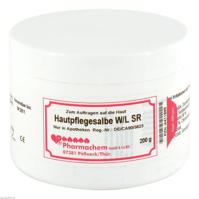Hautpflegesalbe W/L SR pflegt und schützt sowohl die gesunde als auch die umweltbelastete, strapazierte und entzündliche Haut, inbesondere bei Feuchtigkeitsverlust. Nicht anwenden auf großflächigen und offenen Wunden. Die Zubereitung kann beliebig oft angewendet werden.