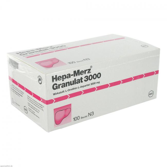 Hepa-Merz Granulat 3000. Wirkstoff: Ornithinaspartat. Anwendungsgebiete: zur Behandlung von Begleit- und Folgeerkrankungen auf Grund gestörter Entgiftungsleistung der Leber (z.B. bei Leberzirrhose) mit den Symptomen der latenten und manifesten hepatischen Enzephalopathie.