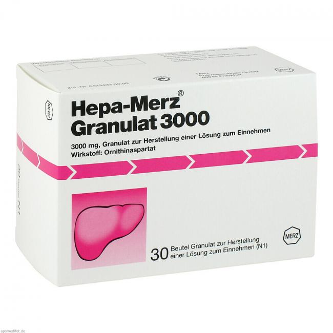 Hepa-Merz Granulat 3000. Wirkstoff: Ornithinaspartat. Anwendungsgebiete: zur Behandlung von Begleit- und Folgeerkrankungen auf Grund gestörter Entgiftungsleistung der Leber (z.B. bei Leberzirrhose) mit den Symptomen der latenten und manifesten hepatischen Enzephalopathie.