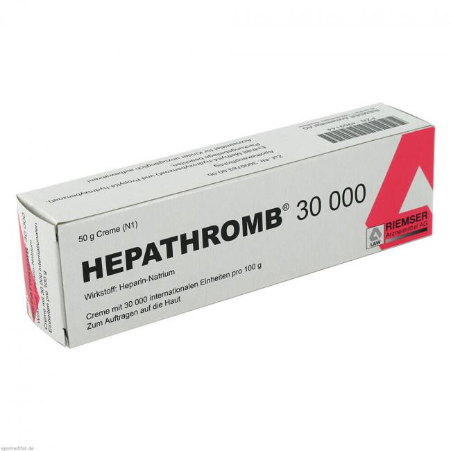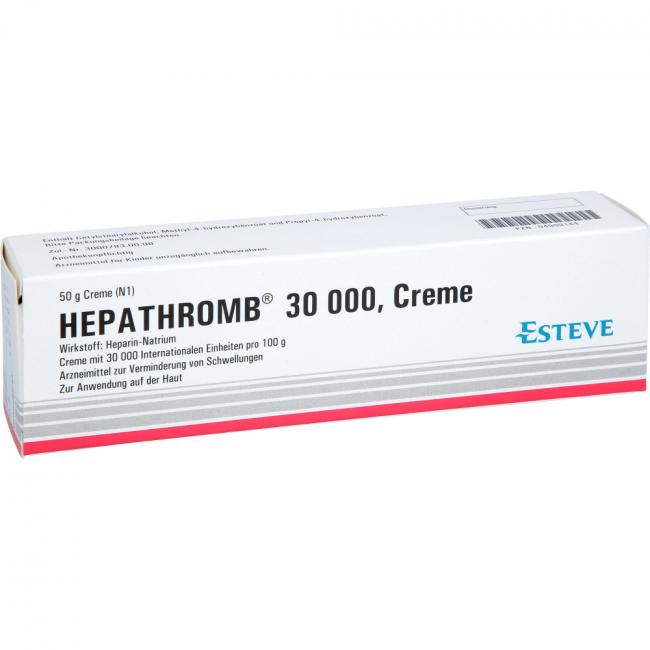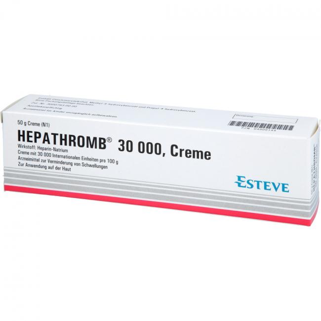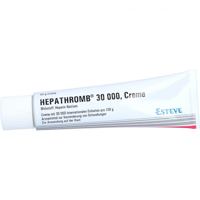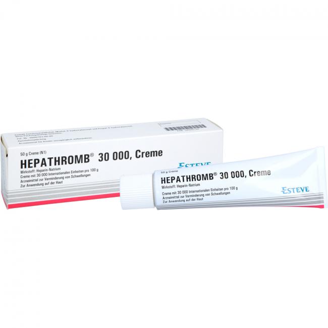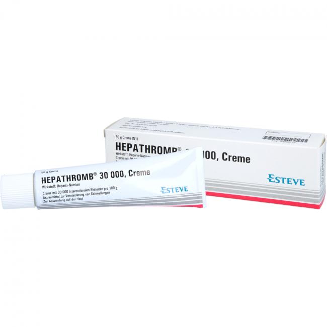 Hepathromb 30.000 Creme. Wirkstoff: Heparin-Natrium. Anwendungsgebiete: Zur unterstützenden Behandlung bei akuten Schwellungszuständen nach stumpfen Verletzungen (Verstauchungen, Prellungen). Warnhinweis: Enthält Cetylstearylalkohol.