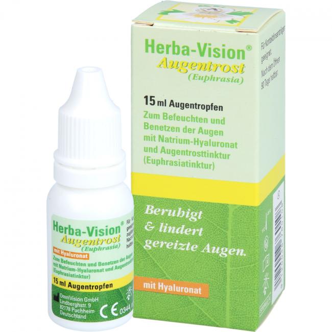 Herba-Vision Augentrost ist eine sterile Lösung zum Befeuchten und Benetzen der Augen mit der körpereigenen benetzenden Substanz Natrium-Hyaluronat und mit Augentrost. Herba-Vision Augentrost kann auch während des Tragens von Kontaktlinsen angewendet werden.