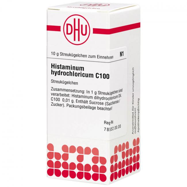 Histaminum hydrochloricum C 100. Anwendungsgebiete: Registriertes homöopathisches Arzneimittel, daher ohne Angabe einer therapeutischen Indikation. Warnhinweis: Dieses Arzneimittel enthält Sucrose (Saccharose / Zucker).