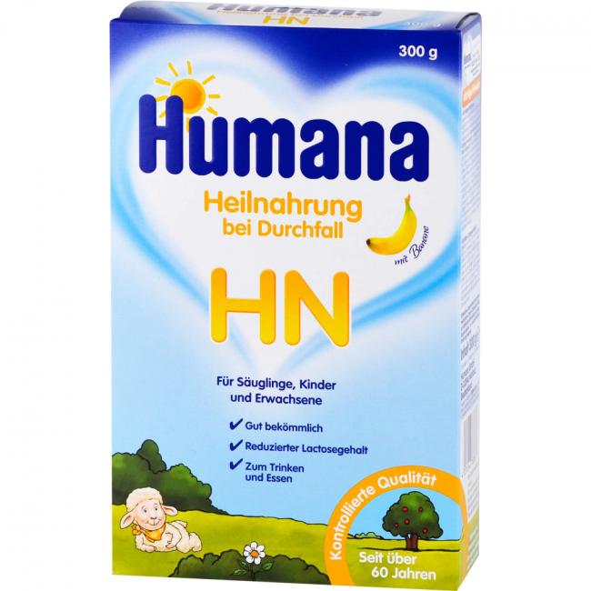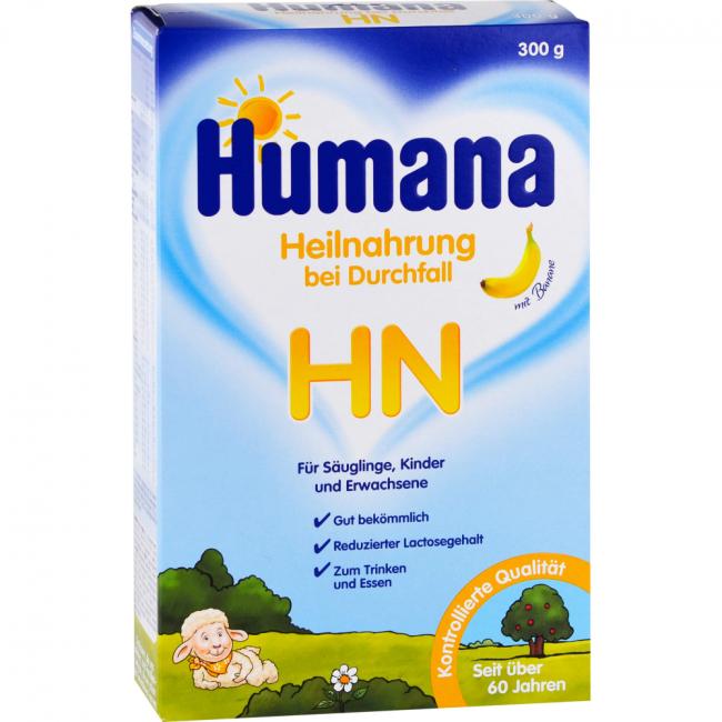 Humana HN Heilnahrung bei Durchfall; diätetisches Lebensmittel geeignet zur Behandlung der Säuglingsdysepsie (Durchfallerkrankung beim Säugling) nur im Rahmen der ärztlichen Verordnung. Nach Absprache kann Humana HN Hellnahrung auch über einen längeren Zeitraum zur ausschließlichen Ernährung von Säuglingen verwendet werden. Wir empfehlen die angebrochene Packung auch nach dem Abklingen des Durchfalls vollständig aufzubrauchen.