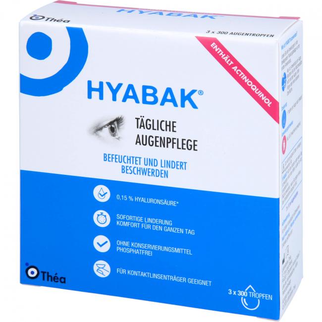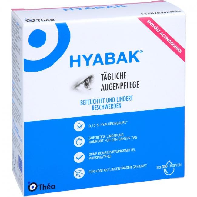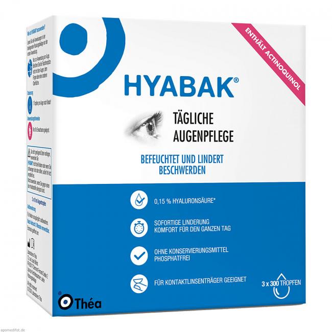 Hyabak ist eine hypotonische Lösung zur Anwendung am Auge oder bei Kontaktlinsen. Es enthält Hyaluronsäure (zur Befeuchtung und Benetzung der Augen und Kontaktlinsen) und Actinoquinol (Wirkstoff mit guten UV-Schutz-Eigenschaften).