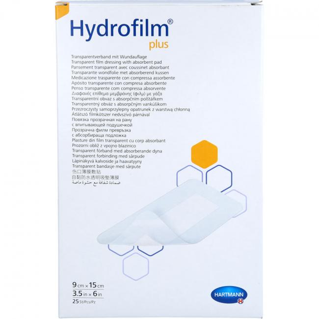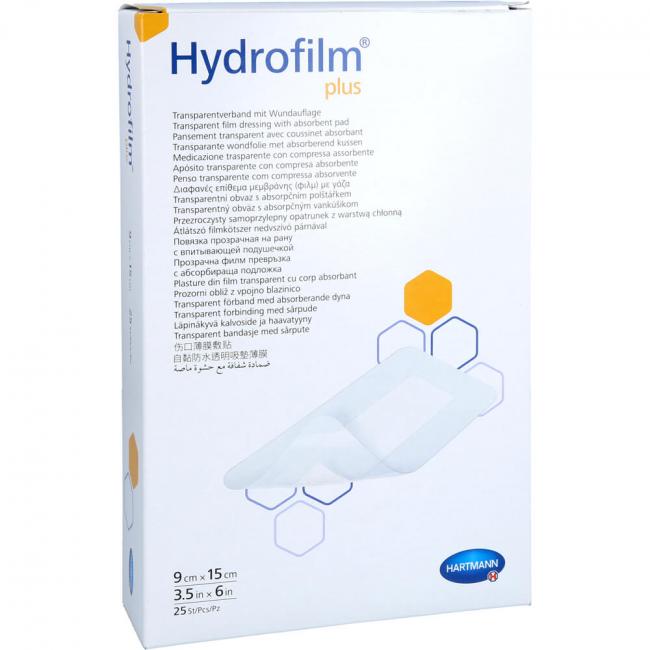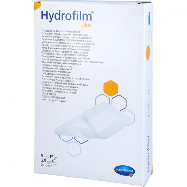 Hydrofilm plus ist ein steriler, selbstklebender Transparentverband mit absorbierender Wundauflage, der für die postoperative Versorgung leicht exsudierender Wunden, als Schutz gegen eindringende Bakterien und als Sterilverband für kleinere Verletzungen geeignet ist.