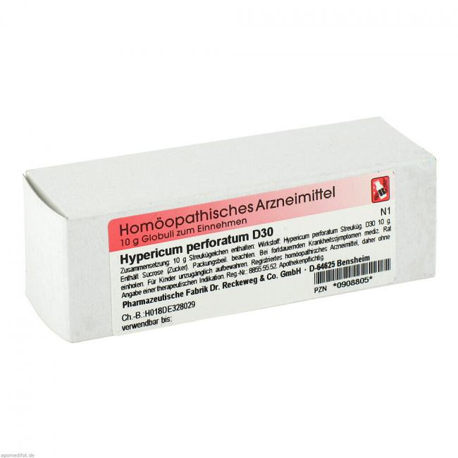 - In 10 g Globuli sind verarbeitet: Wirkstoff: Hypericum perforatum Dil. D30 0,1 g.