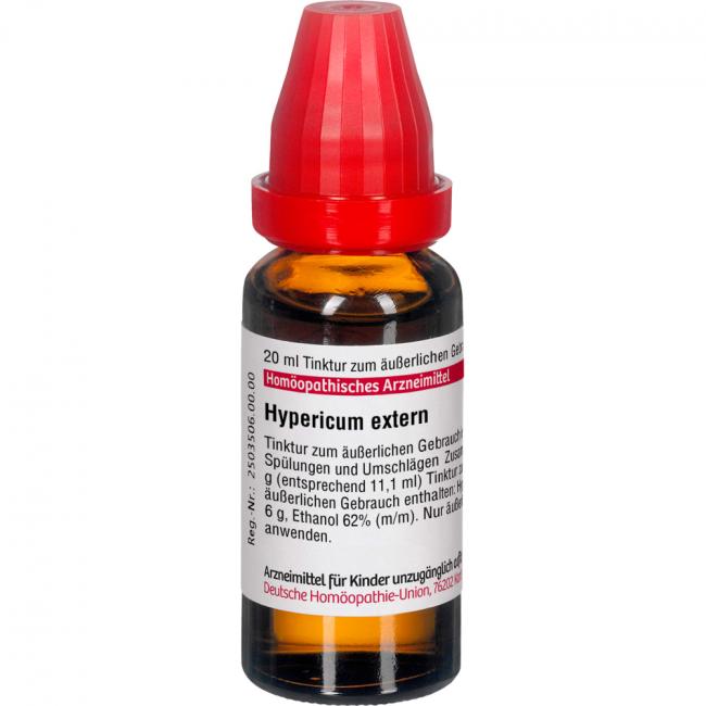 Hypericum extern, Tinktur zum äußerlichen Gebrauch. Wirkstoff: Hypericum. Anwendungsgebiete: Registriertes homöopathisches Arzneimittel, daher ohne Angabe einer therapeutischen Indikation.