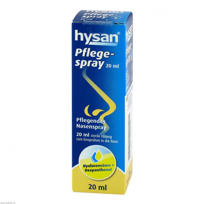 Bei Aufenthalt in trockener, klimatisierter Umgebung, nach Einfluss von Wind und Sonne kann sich die Nasenschleimhaut trocken anfühlen. Dann ist es sinnvoll, durch Anwendung von hysan Pflegespray der Nase intensive Feuchtigkeit zuzuführen und damit die natürliche Feuchtigkeitsbalance wieder herzustellen. hysan Pflegespray enthält das Natriumsalz der Hyaluronsäure, eine natürliche Substanz, die auch im Körper zu finden ist. Sie hat die besondere physikalische Eigenschaft, einen gleichmäßigen, stabilen und besonders lang haftenden Feuchtigkeitsfilm zu bilden. Dadurch hält der feuchtigkeitsspendende Effekt besonders lange an. Darüber hinaus enthält hysan Pflegespray Dexpanthenol, das zu der großen Stoffklasse der B-Vitamine gehört. Durch diesen Bestandteil wird das Bedürfnis der Nasenschleimhaut nach intensiver Regeneration gedeckt und die befeuchtende Eigenschaft von Natriumhyaluronat sinnvoll unterstützt. hysan Pflegespray eignet sich aufgrund dieser speziellen Eigenschaften insbesondere auch als sinnvolle Ergänzung einer Therapie mit schleimhautabschwellenden Nasensprays (bzw. -tropfen) bei Schnupfen. Hierbei sollte hysan Pflegespray über die Anwendungsdauer des abschwellenden Arzneimittels hinaus angewendet werden, um eine optimale Regeneration der Nasenschleimhaut zu unterstützen.